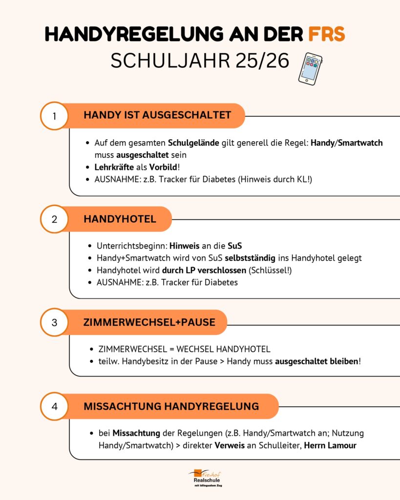 Die Freihof-Realschule führt ab diesem Schuljahr eine handyfreie Regelung ein. Ziel ist es, die Konzentration im Unterricht zu fördern, das soziale Miteinander zu stärken und Ablenkungen zu vermeiden. Mit dieser Maßnahme möchte die Freihof-Realschule ein achtsames und respektvolles Lernumfeld schaffen, in dem alle Schülerinnen und Schüler ihre Zeit gemeinsam sinnvoll gestalten können.