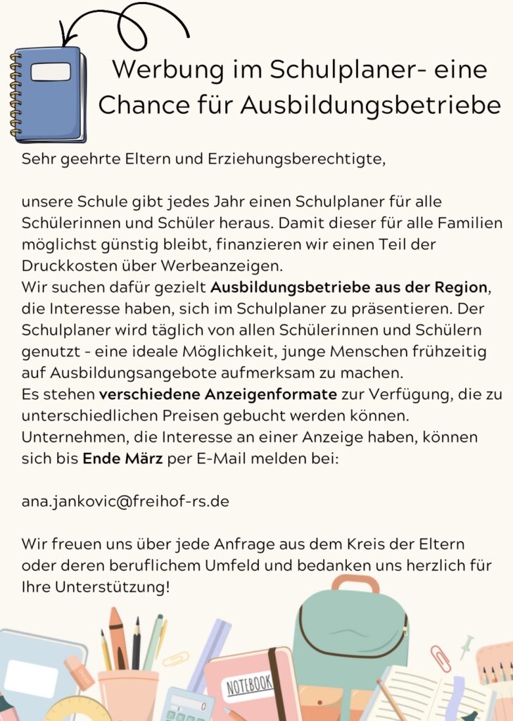 Ihre Werbung im neuen Schulplaner – eine Chance für Ausbildungsbetriebe!